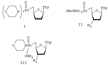 Фосфорамидаты нуклеозидных аналогов, представляющие собой 5′-фосфодиморфолидат 2′,3′-дидезокси-2′,3′-дидегидротимидина (формула I) или фосфорамидаты 3′-азидо-3′-дезокситимидина (формулы II и III), ингибирующие активность репродукции вируса иммунодефицита человека и имеющие следующие формулы: