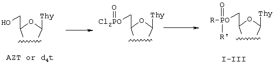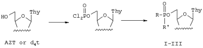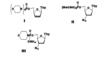 Однако было показано, что в организме это соединение в основном подвергается дефосфорилированию, превращаясь в AZT (Кузнецова Е.В., Куханова М.К., и др. Реакция 5’-Н-фосфонатов, 5’-фторфосфатов и 5’-фосфатов модифицированных тимидинов в плазме крови. – Мол. Биол, 1995, 29, N2, 415-420).