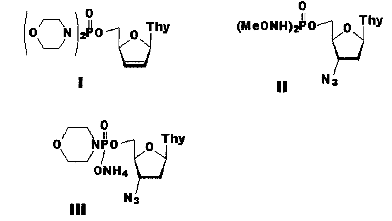 Изобретение относится к фосфорамидатам нуклеозидных аналогов, включающим 5′-фосфодиморфолидат 2′,3′-дидезокси-2′,3′-дидегидротимидина (формула I) и фосфорамидаты 3′-азидо-3′-дезокситимидина (формулы II и III), ингибирующим активность репродукции вируса иммунодефицита человека. Соединения по изобретению устойчивы к действию ферментов дефосфорилирования, способны проникать внутрь клетки и обладают избирательной активностью в подавлении биосинтеза ДНК, катализируемого обратной транскриптазой ВИЧ. 4 фиг., 1 табл.