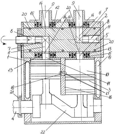В стенке 16 цилиндров 1 в зоне нижней мертвой точки выполнены выпускные окна 17, соединенные с выпускным трубопроводом 18. Блок цилиндров 1 снабжен рубашкой 19 для подвода тепла в камеру 10 расширения. Герметичность золотника 5 и втулок 12, 13 относительно головки 2 обеспечивается уплотнительными элементами 20. Золотник 5 кинематически связан с выходным валом передачей 21.