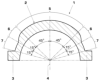 На чертеже показан разрез корпуса 1 согласно варианту выполнения изобретения, который используют для паровых и газовых турбин. Весь корпус состоит из двух одинаковых половин, из которых показана только одна. Корпус 1 состоит из оболочки 2 и двух фланцев 3, которые служат для скрепления с фланцами не изображенной второй половины корпуса 1. Толщина стенок оболочки 2 изменяется в различных зонах. Верхняя, обращенная от фланцев зона 5 усилена по сравнению с нижними, обращенными к фланцам зонами 7. В показанном варианте выполнения толщина стенок верхней, обращенной от фланцев зоны 5 соответствует увеличенной в 1,5 раза толщине стенок нижних, обращенных к фланцам зон 7. Однако, степень усиления верхней зоны может быть различной и зависит от выполнения турбины и тем самым от рабочего давления и рабочей температуры. Однако было установлено, что усиление верхней, обращенной от фланцев зоны 5 не должно более чем в 2 раза превышать толщину стенок нижних, обращенных к фланцам зон 7. Верхняя, обращенная от фланцев зона 5 и нижние, обращенные к фланцам зоны 7 на каждой стороне соединяются средней зоной 6. Толщина стенок этой средней зоны 6 изменяется, так что на каждой стороне обе примыкающие зоны 5, 7 плавно переходят друг в друга. В показанном примере выполнения верхняя, обращенная от фланцев зона 5 расположена предпочтительно в угле 45° вокруг средней оси 4 корпуса 1. К ней по обеим сторонам примыкает в угле 15° средняя зона 6. Однако, возможны также другие значения углов для получения конструкции согласно изобретению. Поскольку средние зоны 6 и, в особенности верхняя, обращенная от фланцев зона 5, за счет большей толщины стенки являются более жесткими, чем нижние, обращенные к фланцам зоны 7, то они во время работы допускают меньшую деформацию, вызванную распределением температур. Нижние, обращенные к фланцам зоны 7 подвергаются большей деформации и действуют в качестве шарнира, который действует выравнивающим образом между выполненными очень массивными и закрепленными болтами фланцами 3 и частично усиленными средними зонами 6, соответственно, усиленной верхней, обращенной от фланцев зоной 5. Это приводит в целом к меньшим радиальным и осевым деформациям корпуса 1 и корпус 1 во время работы турбины остается значительно более круглым. За счет меньшего радиального зазора между корпусом 1 и концами не изображенных турбинных лопаток значительно повышается коэффициент полезного действия.