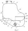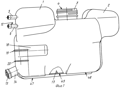 10. дно бачка расширительного выполнено с выступами 47 и 48 и впадиной 49, соответствующими форме установочной площадке корпуса автомобиля, способствующей заполнению свободного пространства опорной площадки и стопорению массы бачка с охлаждающей жидкостью при торможении и разгоне автомобиля.
