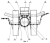 Из ковшей роторов 8 грунт выгружается на транспортеры 11 и направляется в отвал. Очистное устройство внутри роторов 8 удаляет оставшийся в ковшах грунт, который ссыпается в ковши и выгружается на транспортеры 11.