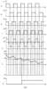 На фиг.2 представлены следующие временные диаграммы: на фиг.2,а – сигнал U1 напряжения на выходе четвертого порогового блока 1, на фиг.2,б – сигнал U15 на выходе пятого порогового блока 15 при равенстве контролируемой частоты номинальной частоте, на фиг.2,в – сигнал U15 на выходе пятого порогового блока 15, когда сдвиг контролируемой частоты относительно эталонной, например, равной частоте сети, приводит к отставанию фазы при прохождении сигнала контролируемой частоты через частотно-зависимый элемент, на фиг.2,г – сигнал U15 на выходе пятого порогового блока 15, когда сдвиг контролируемой частоты относительно эталонной приводит к опережению фазы при прохождении сигнала контролируемой частоты через частотно-зависимый элемент, на фиг.2,д – сигнал U2 на выходе сумматора 2 (для случая отставания фазы), на фиг.2,е – сигнал Е6 на выходе реверсивного счетчика 6 в аналоговом виде, на фиг.2,ж – сигнал U13 на выходе порогового блока 13.