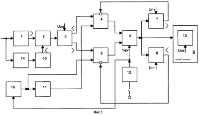 Первый 3, второй 7, третий 8, четвертый 1 и пятый 15 пороговые блоки, а также пороговый блок 13 могут быть выполнены в виде стандартных компараторов, реверсивный счетчик 6 – по схеме, представленной в [3, стр. 177, 187], делитель 11 – в виде двоичного счетчика. Частотно-зависимый элемент 14 может быть выполнен, например, в виде резонансного контура [2, стр. 52, рис. 1.14].