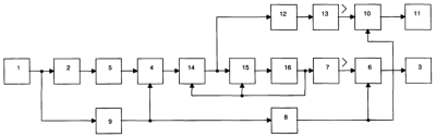Входное напряжение, частота которого может изменяться, поступает на вход разделительного трансформатора 1 и далее на вход второго выпрямителя 9 непосредственно, а на вход первого выпрямителя 5 – через частотно-зависимый элемент 2. Уменьшение амплитуды сигнала на выходе частотно-зависимого элемента 2 пропорционально модулю отклонения частоты от номинальной. Поэтому при частоте входного напряжения, близкой к номинальной, уровни сигнала на выходах первого 5 и второго 9 выпрямителей близки, а сигнал на выходе алгебраического сумматора незначительно отличается от нулевого. Этот сигнал, проходя через блок 14 вычитания и сумматор 15 (на их вторые входы поступают одинаковые сигналы), усредняется во втором фильтре 16 нижних частот. Первый пороговый блок 7 при этом не срабатывает (на его выходе “больше” не формируется уровень логической единицы). Это, в свою очередь, исключает срабатывание первого исполнительного элемента 3. Если частота входного сигнала отклоняется от номинальной за недопустимые пределы, то уровень сигнала на выходе алгебраического сумматора 4 повышается и срабатывает первый пороговый блок 7. Наличие второго выпрямителя 9 исключает ложное срабатывание реле из-за отсутствия или недопустимого снижения уровня напряжения в контролируемой сети. Сигналы с уровнями логической единицы на входе первого элемента И 6 объединяются этим элементом, что приводит к срабатыванию первого исполнительного элемента 3.