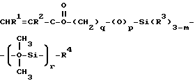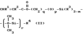 Предпочтительные полисилоксановые макромеры (C) формулы (I) выбираются из макромеров, соответствующих общей формуле (II):![]() где заместитель R1 представляет собой атом водорода или -COOH (предпочтительно атом водорода); заместитель R2 представляет собой атом водорода, метил или -CH2COOH (предпочтительно метил); заместитель R3 представляет собой C1-C6-алкил, алкокси- или алкиламиногруппу, C6-C12-арил или гидроксил (предпочтительно метил); заместитель R4 представляет собой C1-C6-алкил, алкокси- или алкиламиногруппу, C6-C12-арил или гидроксил (предпочтительно метил); q принимает целые значения от 2 до 6 (предпочтительно равно 3); p принимает значения 0 или 1; r принимает целые значения от 5 до 700; m принимает целые значения от 1 до 3 (предпочтительно равно 1). Более предпочтительными являются полисилоксановые макромеры формулы: ![]() где n принимает значения от 5 до 700. Один из заслуживающих внимания вариантов осуществления изобретения включает использование сополимера, который может быть получен радикальной полимеризацией исходной мономерной смеси, содержащей: а) 60 вес.% трет-бутилакрилата; б) 20 вес.% акриловой кислоты; с) 20 вес.% кремнийорганического макромера формулы: ![]() где n принимает целые значения в интервале от 5 до 700; причем проценты рассчитаны относительно общего веса мономеров. Другой заслуживающий внимания вариант осуществления настоящего изобретения заключается в использовании сополимера, который может быть получен радикальной полимеризацией мономерной смеси, содержащей: а) 80 вес.% трет-бутилакрилата; б) 20 вес.% кремнийорганического макромера формулы: ![]() где n принимает целые значения в интервале от 5 до 700; причем проценты рассчитаны относительно общего веса мономеров. Другую предпочтительную группу кремнийорганических полимеров, которые могут быть использованы при осуществлении настоящего изобретения, составляют привитые кремнийорганические сополимеры, которые могут быть получены реакционной экструзией полисилоксанового макромера, имеющего концевую реакционноспособную функциональность, с полимером полиолефинового типа, содержащим реакционноспособные группы, которые могут реагировать с концевой функциональностью полисилоксанового мономера с образованием ковалентной связи, которая обеспечивает прививку силикона на основную цепь полиолефина. Такие полимеры и способы их получения описаны в патентной публикации WO 95/00578. Реакционноспособные полиолефины предпочтительно выбираются из числа полиэтиленов или полимеров мономеров, полученных из этилена, таких как пропилен, стирол, алкилстирол, бутилен, бутадиен, (мет)акрилат, виниловые эфиры и их эквиваленты, содержащие реакционноспособные функциональные группы, которые могут взаимодействовать с концевыми функциональностями полисилоксанового макромера. Их выбирают предпочтительно из сополимеров этилена или производных этилена и мономеров из числа содержащих карбоксильную функциональную группу, таких как (мет)акриловая кислота; содержащих функциональность ангидрида кислоты, таких как малеиновый ангидрид; содержащих функциональность хлорангидрида кислоты, таких как (мет)акрилоилхлорид; содержащих сложноэфирную функциональность, таких как эфиры (мет)акриловой кислоты; содержащих изоцианатную функциональность. Кремнийорганические макромеры предпочтительно выбираются из числ