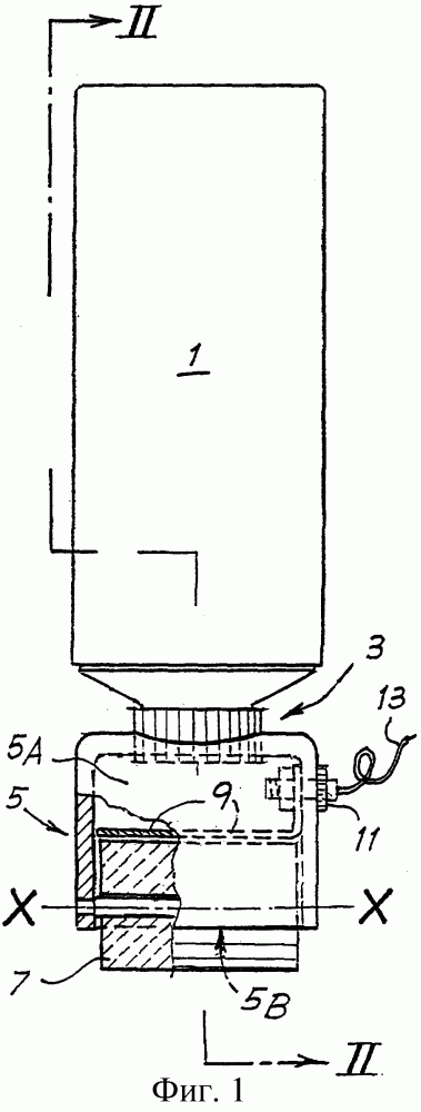 На фигурах 1 и 2 изображено устройство, содержащее цилиндрический контейнер 1 с резьбовым входным отверстием 3 для дозатора 7, образующие распределительную камеру 5А. Такая распределительная камера связана с контейнером 1 и имеет прямоугольное отверстие 5В, которое, за исключением минимального зазора, практически закрыто с помощью дозатора 7, выполненного в виде ролика, вращающегося вокруг собственной оси Х-Х. Внутри распределительной камеры закреплен энергоснабжающий элемент 9 в виде металлической скобы, располагающийся, главным образом, вблизи цилиндрической поверхности ролика, к которой может быть приложен электрический потенциал с помощью клеммы 11 и гибкого электрического проводника 13, причем указанный проводник соединен с подходящим источником электрической энергии.