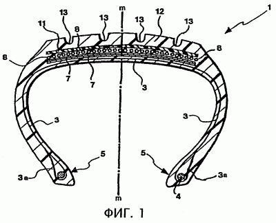 Над брокером 7 находится 0°-слой, в котором корд 8, например, изготовленный из найлона, намотан по спирали соосно шине; как обычно, угол намотки корда 8 по отношению к медианной плоскости m-m шины небольшой, и указанный корд также заделан в слой резины, как это обычно делают в уровне техники (используя так называемые “ленты” или иные решения).