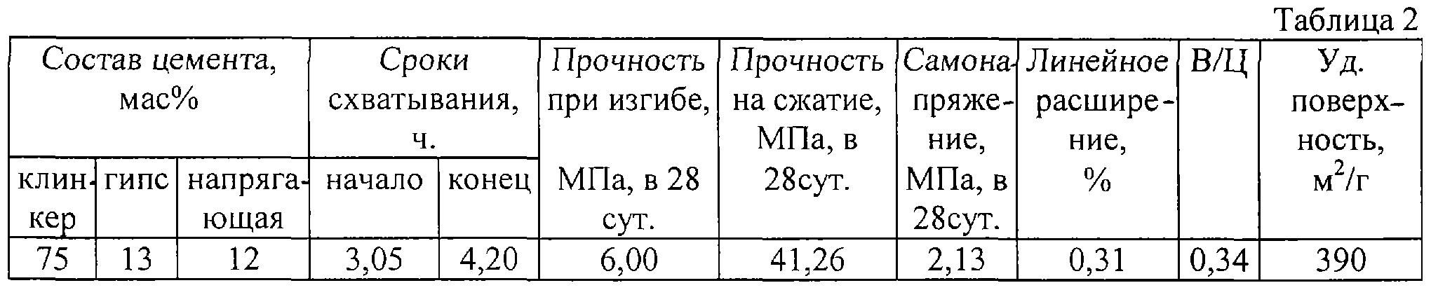 Изобретение относится к строительству, может быть использовано при возведении монолитных бетонных и железобетонных конструкций специального назначения. Наиболее близким из аналогов является изобретение (авторское свидетельство СССР №1662972, С 04 В 7/00, 1991 г.) Заявляемое изобретение направлено на решение задачи по производству вяжущего, состав которого позволяет значительно снизить материальные и энергозатраты. Технический эффект достигается за счет использования дешевой напрягающей алюминатной добавки, представленной шамотной пылью Суворовского рудоуправления Тульской области, согласно ТУ 1522-009-00/90485-99, и содержащей больше 30% Аl2O3, портландцементного клинкера производства ОАО “Подольск-Цемент” и новомосковского двуводного гипса путем совместного помола компонентов, за счет чего происходит экономия энергоресурсов. Цель изобретения – повышение степени самонапряжения, использование отходов производств, снижение материальных затрат и энергоресурсов. Напрягающий цемент, включающий портландцементный клинкер, гипс и напрягающую алюминатную добавку, содержит напрягающую алюминатную добавку состава, мас.%: п.п.п. – 6,31; SiO2 – 52,78; Аl2O3 – 34,97; Fе2O3 – 3,80; СаО – 1,43; MgO – 0,20; SO3 – 0,15, при следующем соотношении компонентов, мас. %: двуводный гипс – 12, указанная алюминатная напрягающая добавка – 13, портландцементный клинкер – 75. Приготовление цементного теста, формование и испытание образцов осуществляют по ГОСТ 310.4.81. Самонапряжение определяют по ТУ-5743-157-46854090-2003. Химический состав напрягающей добавки приведены в табл. 1.