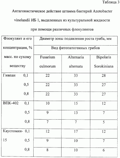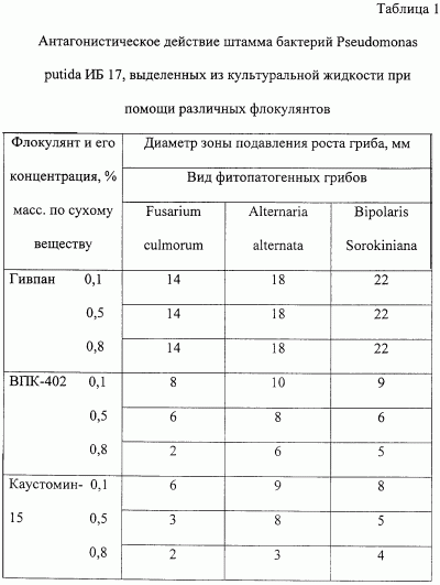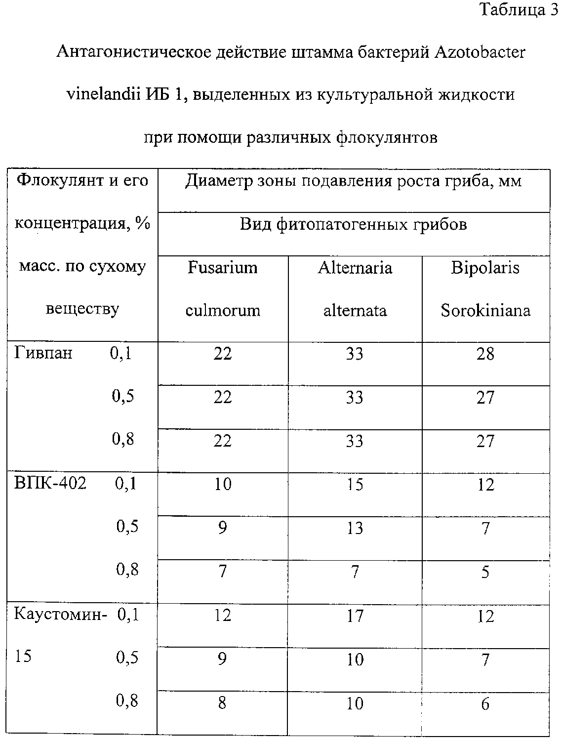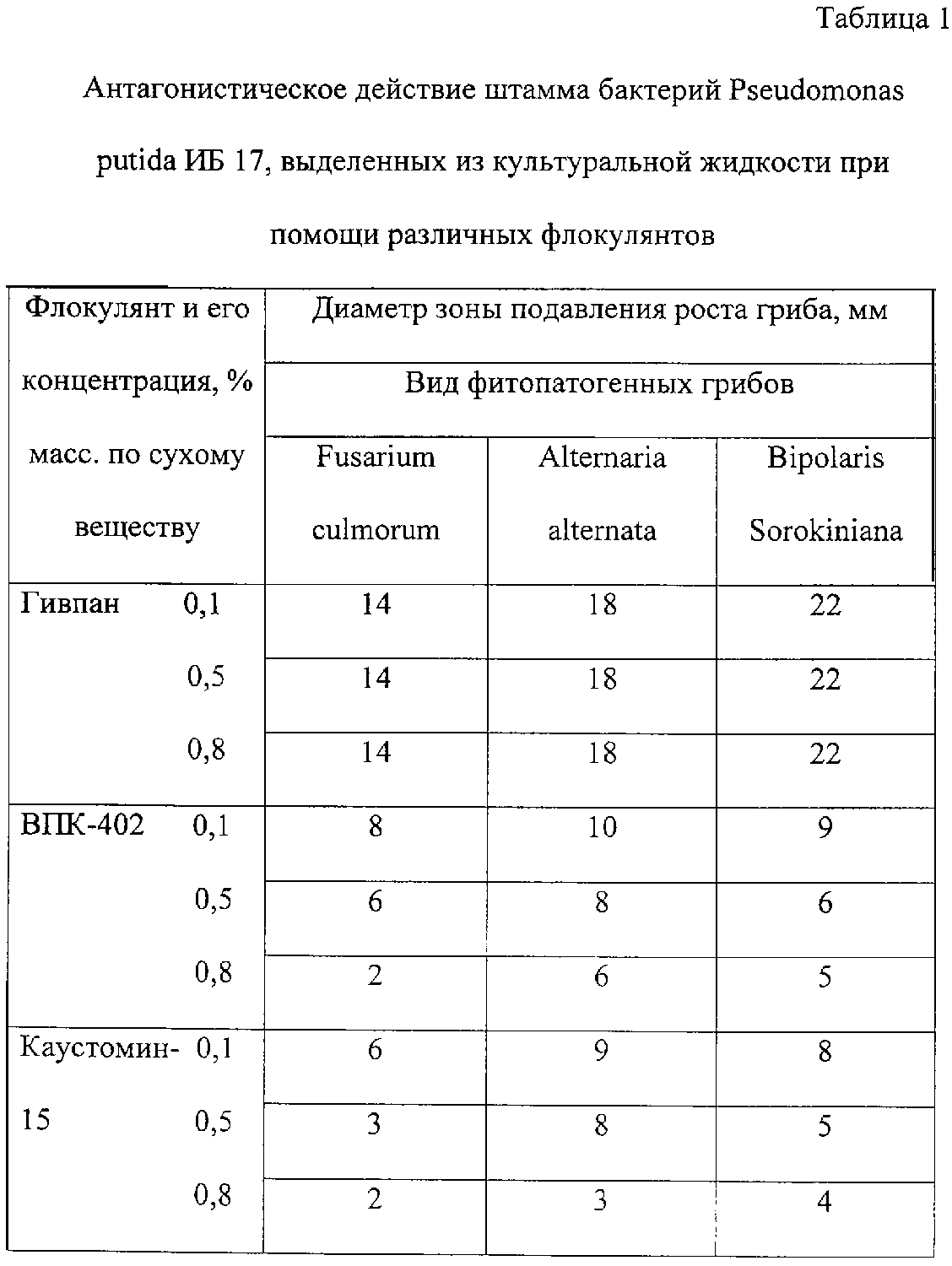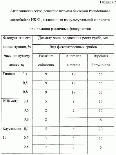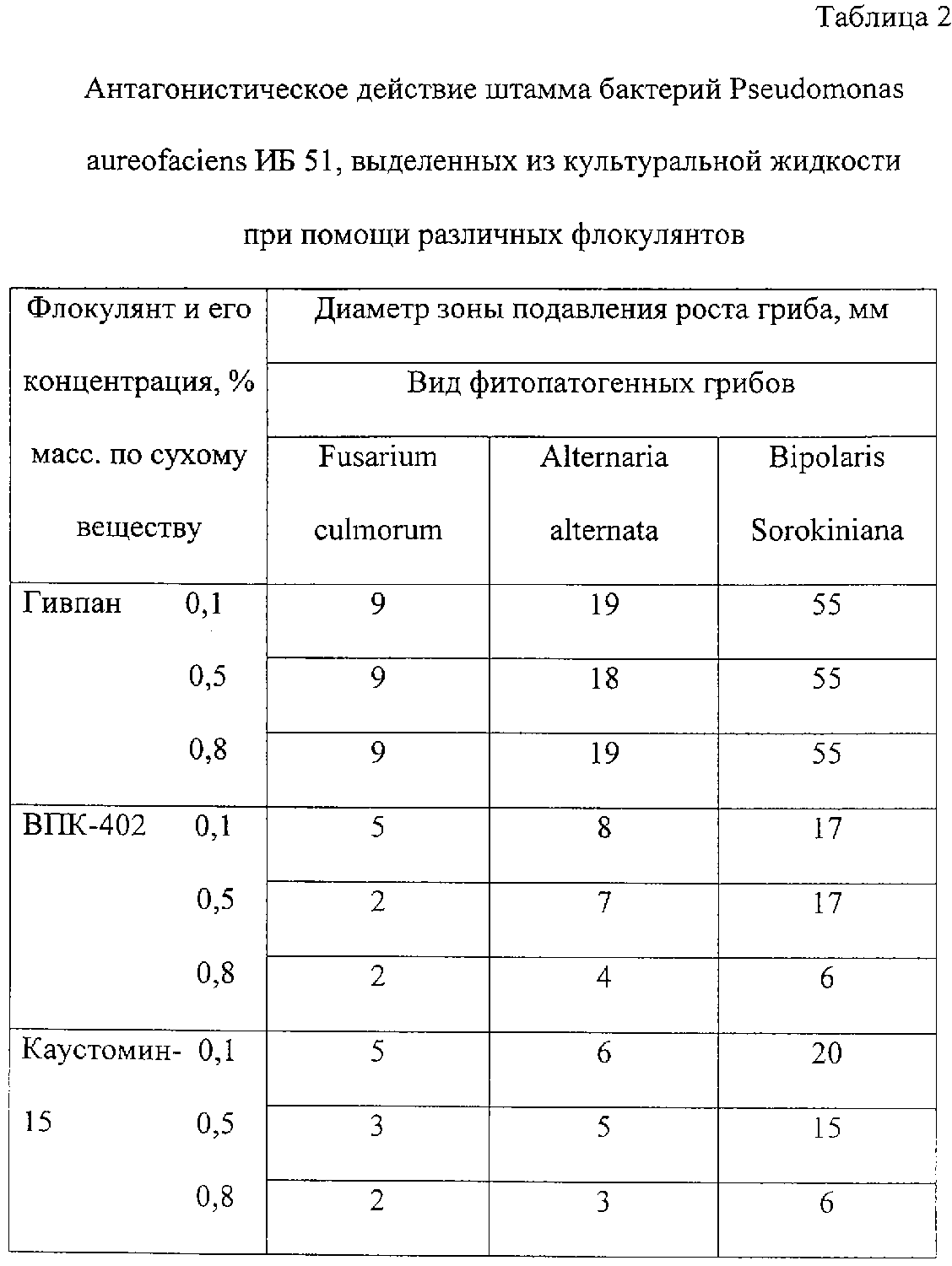 Изобретение относится к биотехнологии и касается способа выделения биомассы микроорганизмов из культуральной жидкости действием флокулянта. Известны способы выделения биомассы микроорганизмов из культуральной жидкости, предусматривающие добавление высокомолекулярных реагентов-флокулянтов с последующим отделением осадка. В качестве высокомолекулярных реагентов используют поли-1-этил-2-метил-5-винилпиридиний бромид [1], фталоилжелатину или сополимер акриловой кислоты и 2-метил-5-винилпиридина [2], сополимер акрилонитрила с N-триметиламмонийэтилметакрилат-метилсульфатом [3]. Недостатками известных способов являются невысокая эффективность, кроме того некоторые из них [1, 2] приемлимы только для выделения дрожжевой биомассы. Наиболее близким по технической сущности и принятым за прототип является способ, связанный с использованием в качестве флокулянта катионогенного водорастворимого полиэлектролита поли-N,N-диметил-N,N-диаллиламмоний хлорида [4]. Недостатком указанного способа является то, что использование указанного катионогенного полиэлектролита в некоторых случаях приводит к значительному снижению численности, и активности осажденных клеток. Технической задачей изобретения является повышение качества процесса выделения биомассы, заключающееся в сохранении численности жизнеспособных клеток и их активности, в частности антагонистической активности по отношению к различным грибным фитопатогенам. Поставленная задача решается путем применения в качестве флокулянта в процессе выделения биомассы водорастворимого полимера “гивпан”, представляющего собой продукт гидролиза полиакрилонитрильного сополимера акрилонитрила с метакрилатом. Промышленное производство “гивпана” осуществляется на ГУП “Опытный завод Академии Наук Республики Башкортостан” (г.Уфа) в соответствии с ТУ 2216-001-04698227-99, известно его использование в качестве ингредиента бурового раствора. Антагонистическая активность микробных клеток выделенной биомассы определяется следующим образом. На чашки Петри с глюкозо-пептонным агаром (глюкоза – 5 г; пептон – 5 г; калий фосфорнокислый двузамещенный – 4 г; калий фосфорнокислый однозамещенный – 2 г; вода дистиллированная – 1 л) высевают сплошным газоном суспензию спор грибного фитопатогена. В качестве тест-грибов используются микромицеты, вызывающие плесневение семян и корневые гнили злаковых культур: Bipolaris sorokiniana, Alternaria alternata, Fusarium culmorum. Затем на эти же чашки уколом сажают бактерии-антагонисты, относящиеся к классу псевдомонад. Чашки инкубируют при 28°С в течение 3 суток. Учет проводят по зонам отсутствия или подавления роста грибов вокруг колонии штамма. При использовании в качестве бактерий-антагонистов представителей рода Azotobacter на чашки Петри наносится агаризованная среда КГА (картофель тертый – 200 г; глюкоза – 20 г; агар – 20 г; вода водопроводная – 1 л). Пример 1. В культуральную жидкость, полученную при выращивании штамма-антагониста грибных фитопатогенов Pseudomonas putida ИБ 17 [5], с титром микроорганизмов 1,3·109 КОЕ/мл на питательной среде Кинг В, вводят флокулянт “гивпан” в количестве 0,1-0,8% (по сухому веществу). Параллельно в эту культуральную жидкость в аналогичном количестве вводят флокулянт по известному способу – ВПК-402. Кроме того, в качестве аналога в эту культуральную жидкость параллельно 
