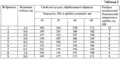 Предлагаемое изобретение относится к черной металлургии, а именно к литейному производству, и может быть использовано при производстве синтетического чугуна. Известна смесь для модифицирования чугуна /А.С. 1548213 СССР, С 21 С 1/08, С 22 С 35/00, БИ №9,1990. /. Смесь содержит ферросиликохром 40-65%; силикомарганец 20-45%; отходы электродного производства 10-20%. Применение смеси позволяет на 20-25% снизить отбеливаемость чугуна и смесь выполняет только функции модификатора. Известен модификатор для чугуна / А.с. 1625897 СССР, С 22 С 35/00, БИ №5, 1991./, включающий углеродсодержащий материал и кремнийсодержащий ферросплав с добавками активных элементов при следующем соотношении компонентов, мас.%: сажистое железо (с 20-30% углерода) 10-40; кремнийсодержащий ферросплав с добавками активных элементов 60-90. Указанный модификатор повышает графитизирующую способность и однородность механических свойств в отливках. Известен модификатор для чугуна /Патент РФ 2069702, С 21 С 1/00, С 22 С 35/00/. По данному изобретению модификатор содержит дисперсный порошок карбида кремния, полученный плазмохимическим синтезом, плакированный углеводородами метанового ряда. Данный состав выполняет только функции модификатора. Известен модификатор для чугуна /Патент РФ №2180363, С 22 С 35/00, 1/05/, содержащий компоненты в следующем соотношении, мас.%: кремний 20-55; углерод 20-65 и/или карбид кремния 30-40; кальций 0,5-6,0; железо остальное. По изобретению модификатор может содержать один элемент, выбранный из группы, включающей, мас.%: магний 1-3; титан 1-5; цирконий 1-5; редкоземельные металлы 1-5; стронций не более 2; барий 2-6. Данный состав выполняет только функции модификатора. Известен брикет, содержащий кремнийсодержащие остатки /Патент РФ 2124058, МПК С 22 В 1/242 /. По данному изобретению брикет содержит кремнийорганические остатки, 1-10% по сухому весу картонной фибры, 5-40% по весу гидравлического цемента, остальное – кремний. Данный состав используется в качестве добавок для металлургических целей. Наиболее близким по технической сущности и достигаемому эффекту является модифицирующий брикет для синтетического чугуна /А.с. 1574667, С 22 С 35/00, Бюл. 24, 1990./, который содержит, мас.%: ферросилиций ФС75 5,0-8,0; коксик 80,0-85,0; 40%-ный водный раствор твердых осадков технических лигносульфонатов 10,0-12,0. Применение данных брикетов позволяет в 2-2,5 раза снизить отбел в тонкостенных отливках, но не устраняет его полностью, обеспечивает только донауглероживание расплава. Технической задачей изобретения является создание добавки для производства синтетического чугуна такого состава, который позволит обеспечить устранение отбела в тонкостенном литье, стабилизацию твердости по глубине отливки, повышение усвоения углерода, а также использовать в составе металлургического брикета вторичный материал производства углеграфитовой продукции и ферросплавного производства. Поставленная задача решается за счет того, что металлургический брикет содержит в качестве углерод- и кремнийсодержащего материала вторичный продукт электротермического производства углерод-кремнистую смесь, в качестве связующего используют материалы из группы оксидных систем, образующих цементы, дополнительно содержит ферросилиций фракции от 0 до 5 мм при следующем соотношении компонентов, мас.%: Углерод-кремнистая смесь 65-80% Ферросилиций 7-15% Связующее 13-20% В отличие от большинств
