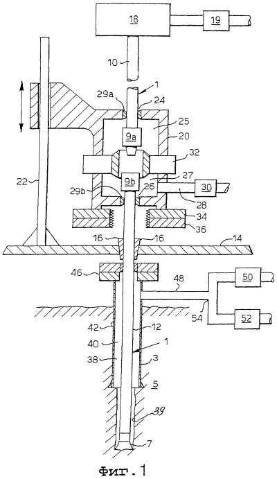 На фиг.1 показана бурильная колонна 1, проходящая в буровую скважину 3, образованную в пласте 5, и снабженная буровой головкой 7 и устройством забоя скважины (на чертеже не показано). Бурильная колонна 1 выполнена из множества сочленений бурильной колонны, вследствие чего каждая пара прилегающих сочленений соединена между собой отсоединяемым соединительным зажимом. Для ясности показан только один из соединительных замков 9а, 9b, расположенных в самом верху, который соединяет самое верхнее сочленение с остальной бурильной колонной 1 (показан в отсоединенном виде). В последующем описании верхнее сочленение бурильной колонны называется верхней секцией 10 бурильной колонны, а остальная часть бурильной колонны 1 называется нижней секцией 12 бурильной колонны. Нижняя секция 12 бурильной колонны удерживается на полу 14 буровой установки (не показана) приводными клиновыми захватами 16 для бурильных и обсадных труб. Верхняя секция 10 бурильной колонны удерживается верхним приводным блоком 18, способным поддерживать всю бурильную колонну 1, и который снабжен приводной системой (не показана) для вращения бурильной колонны 1 во время бурения. Первичный насос 19 сообщается с верхней секцией бурильной колонны для накачки бурового раствора через бурильную колонну 1, когда соединительный замок 9а, 9b находится в режиме соединения.