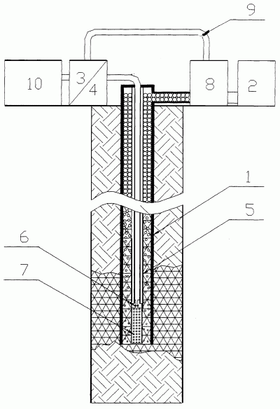 Наличие этой силы, вызванной действием силы гравитации, позволяет создать пену по всей глубине скважины. А работа этой силы с учетом работы паров рабочей жидкости при расширении, в конечном итоге, направлена на увеличение разности между давлением окружающих нефтяных пластов и давлением на дне скважины. По закону сообщающихся сосудов нефть постоянно заполняет межтрубное пространство напорного 5 и заборного трубопроводов 1.