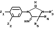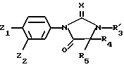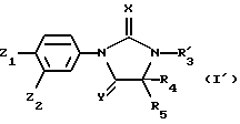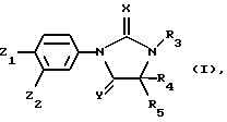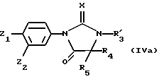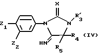 6. Способ получения замещенных фенилимидазолидинов формулы I по п.1 или 2, отличающийся тем, что соединение формулы II, указанной выше, в присутствии третичного основания вводят во взаимодействие с соединением формулы III’![]() в которой R’3, R4 и R5 имеют значение, указанное выше; Q означает атом щелочного металла или алкильный радикал, содержащий 1 – 6 атомов углерода, для получения продукта формулы IVа: ![]() в которой Х, Z1, Z2, R’3, R4 и R5 имеют вышеуказанные значения, который при желании подвергают одной или нескольким реакциям в любом порядке: а) реакции удаления возможных защитных групп, которые может нести радикал R’3; б) реакции превращения группы или групп в группу или, при желании, группы в группу в) воздействию на продукт формулы IVа, в которой R’3 означает атом водорода, реактивом формулы Гал-R”3, в которой R”3 имеет значения радикала R’3, за исключением водорода, и Гал означает атом галогена, для получения продукта формулы I, затем, при желании, и при необходимости воздействию на этот продукт агентом удаления возможных защитных групп, которые может нести радикал R”3, или при желании, действию агента этерификации, аминирования или солеобразования, причем полученные продукты формулы I находятся во всех возможных изомерных, рацемических, энантиомерных и диастереоизомерных формах.