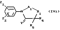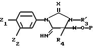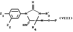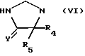 5. Способ получения замещенных фенилимидазолидинов формулы I по п.1 или 2, отличающийся тем, что соединение формулы II, указанной выше, в присутствии третичного основания вводят во взаимодействие с соединением формулы VII![]() в которой W имеет указанное для R5 значение, за исключением алкильного радикала, замещенного гидроксилом, свободным, этерифицированным до простого или сложного эфира или защищенным; и Р означает защитную группу ОН-функции или такой радикал, что -О-Р означает этерифицированный до простого эфира гидроксил; R’3 и R4 имеют значения, указанные выше, для получения продукта формулы VIII ![]() в которой Х, Z1, Z2, R’3, R4, W и Р имеют указанное выше значение, в котором, при желании или при необходимости, высвобождают из группы ОР радикал ОН, который при необходимости или при желании, этерифицируют до сложного эфира или превращают в галоидный радикал, затем, при желании или при необходимости, продукт формулы VIII подвергают одной или нескольким следующим реакциям в любом порядке: а) реакции удаления возможных защитных групп, которые может нести радикал R’3; б) реакции гидролиза группы до карбонильной группы и, при необходимости, превращения группы в группу в) реакции превращения группы или групп в группу г) воздействию на продукт формулы VIII, в которой R’3 означает атом водорода и после гидролиза группы до карбонильной группы, реактивом формулы Гал-R”3, в которой R”3 имеет значения радикала R’3, за исключением водорода, и Гал означает атом галогена, для получения продукта формулы I по п.1 или 2, затем, при желании, воздействию на полученный продукт агентом удаления возможных защитных групп, которые может нести R”3, или, при желании, агентом этерификации, аминирования или солеобразования, причем полученные продукты формулы I находятся во всех возможных изомерных, рацемических, энантиомерных или диастереоизомерных формах.