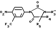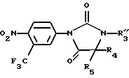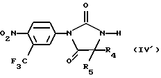 Из предпочтительных соединений согласно изобретению более конкретно можно назвать соединения формулы (I), названия которых следующие:-2-(трифторметил)-4-(4-(гидроксиметил)-4-метил-2,5- диоксо-1-имидазолидинил)бензонитрил; -4-(3,4-диметил-4-(гидроксиметил)-5-оксо-2-тиоксо- 1-имидазолидинил)-2-(трифторметил)бензонитрил; -2-(трифторметил)-4-(4-(гидроксиметил)-3,4-диметил-2,5- диоксо-1-имидазолидинил)бензонитрил; -4-(2,5-диоксо-3-(2-фторэтил)-4-(гидроксиметил)-4-метил- 1-имидазолидинил)-2-(трифторметил)бензонитрил; -1,5-диметил-5-(гидроксиметил)-3-(4-нитро-3-(трифторметил)-фенил) -имидазолидин-2,4-дион; 4-(4,4-бис(гидроксиметил)-2,5-диоксо-1-имидазолидинил)-2- (трифторметил)бензонитрил; причем вышеуказанные соединения формулы (I) находятся в любых возможных изомерных рацемических, энантиомерных и диастереоизомерных формах; а также их соли присоединения неорганических или органических кислот или соли присоединения неорганических или органических оснований. Еще более конкретно, изобретение относится к следующим предпочтительным соединениям: -4-(4-(фторметил)-3,4-диметил-2,5-диоксо-1-имидазолидинил)-2- (трифторметил)-бензонитрил; -4-(3,4-диметил-4-(фторметил)-5-оксо-2-тиоксо-1-имидазолидинил)- 2-(трифторметил)-бензонитрил; -4-(2,5-диоксо-3-(2-фторэтил)-4-(фторметил)-4- метил-1-имидазолидинил)-2-(трифторметил)бензонитрил; -1,5-диметил-5-(фторметил)-3-(4-нитро-3-(трифторметил)фенил)- имидазолидин-2,4-дион; -3-(4-циано-3-(трифторметил)фенил)-2 4-диоксо-5- (фторметил)-5-метил-1-имидазолидинацетонитрил; -4-(4,4-бис-(фторметил)-3-метил-5-оксо-2-тиоксо-1- имидазолидинил-2-(трифторметил)бензонитрил; причем вышеназванные соединения формулы (I) находятся в любых возможных рацемических, энантиомерных и диастереоизомерных формах; а также их соли присоединения неорганических или органических кислот или соли присоединения неорганических или органических оснований. Изобретение относится также к способу получения соединений формулы (I) и к его вариантам. Так, замещенные фенилимидазолидины формулы (I) могут быть получены путем взаимодействия соединения формулы (II): ![]() в которой Z1, Z2 и X имеют указанные выше значения, в присутствии третичного основания, с соединением формулы (III): ![]() в которой R4 и R5 имеют указанное выше значение, и R3 имеет значения, указанные выше для радикала R3, в котором возможные реакционноспособные функции при необходимости защищены, для получения соединения формулы (IV): ![]() в которой Z1, Z2, X, R4 и R5 имеют вышеуказанное значение, которое при желании подвергают одной или нескольким следующим реакциям в любом порядке: а) реакции удаления защитных групп, которые может нести R3‘; б) реакции гидролиза группы до карбонильной и при необходимости превращению группы в группу ![]() в) реакции превращения группы или групп в группу ![]() г) воздействию на соединение формулы (IV), в которой R3‘ означает атом водорода, и после гидролиза группы до карбонильной, реактивом формулы Гал-R3”, в которой R3” имеет значения R3‘ за исключением водорода, а Гал означает атом галогена, для получения продукта формулы (I), затем, при желании, воздействию на полученный продукт агентом удаления возможных защитных групп, которые может нести R3”, или при желании, агентом этерификации, агентом аминирования или агентом солеобразования, причем полученные соединения формулы (I) находятся во всех возможных изомерных, рацемических, энантиомерных и диастереоизомерных