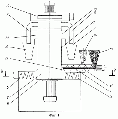 Через патрубки 9, тангенциально примыкающие к цилиндрическому корпусу 7 в его нижней части, в рабочую зону сушильной камеры 2 поступает теплоноситель, который нагревают посредством теплогенераторов 3. Теплоноситель, поступающий в сушильную камеру 2, перемещается в восходящем направлении в рабочей зоне цилиндрического корпуса 7 в виде закрученного потока, подхватывая частицы однородной смеси, предварительно дробленых с помощью измельчителя 8.