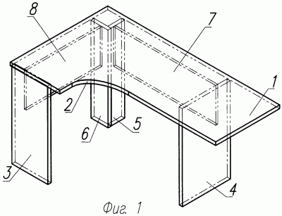 1. Стол офисный, содержащий столешницу, три стороны которой выполнены прямолинейными, а четвертая имеет криволинейный участок, и опорное основание, отличающийся тем, что четвертая сторона столешницы выполнена с выемкой, состоящей из соединенных между собой вогнутого криволинейного участка и по меньшей мере двух прямолинейных участков, при этом опорное основание стола состоит из пластин, две из которых образуют ножки, параллельные двум прямолинейным участкам сторон столешницы, а две другие, соединенные под углом, обращенным открытой частью наружу столешницы, образуют ножку у ее свободного угла, причем ножки из пластин соединены с пластинами угловой ножки попарно между собой балками.