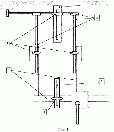 На фиг.1 изображена схема модифицированного торакального ранорасширителя. Он состоит из стандартного торакального ранорасширителя (1). К стандартному торакальному ранорасширителю с помощью системы стоек (2), изменяющих свою геометрию в продольном и поперечном направлении, устанавливается дополнительный крючок (3) для осуществления тракции мягких тканей верхнего угла раны в краниальном направлении (вверх). Дополнительный крючок и стойки крепятся к ранорасширителю (1) при помощи фиксирующих винтов (4). Кроме того, к основанию стандартного ранорасширителя крепится дополнительный крючок (5) для осуществления тракции мягких тканей в каудальном направлении (вниз). Нижний крючок (5) так же подвижен, так как закреплен на ранорасширителе с помощью винта (6).