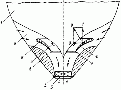 Устройство работает следующим образом. При движении судна забортная вода засасывается в водовод 2. По мере движения воды в водоеме скорость потока в результате уменьшения площади “живого” сечения водовода увеличивается. Поток воды набегает на профилированное кольцо 6, нижняя часть которого имеет пластинчатый интерцептор 7 и искусственную шероховатость 8, укрепленное на пиллонах 9 под углом атаки к вектору скорости потока. На кольце как на крыле возникают подъемная сила Р и сила сопротивления R. Проекция силы Р на продольную ось дает дополнительную силу тяги Т. Ориентировочные расчеты показывают, что дополнительная сила тяги профилированного кольца с учетом силы его сопротивления и силы трения равна не менее 15-20% упора движителя.