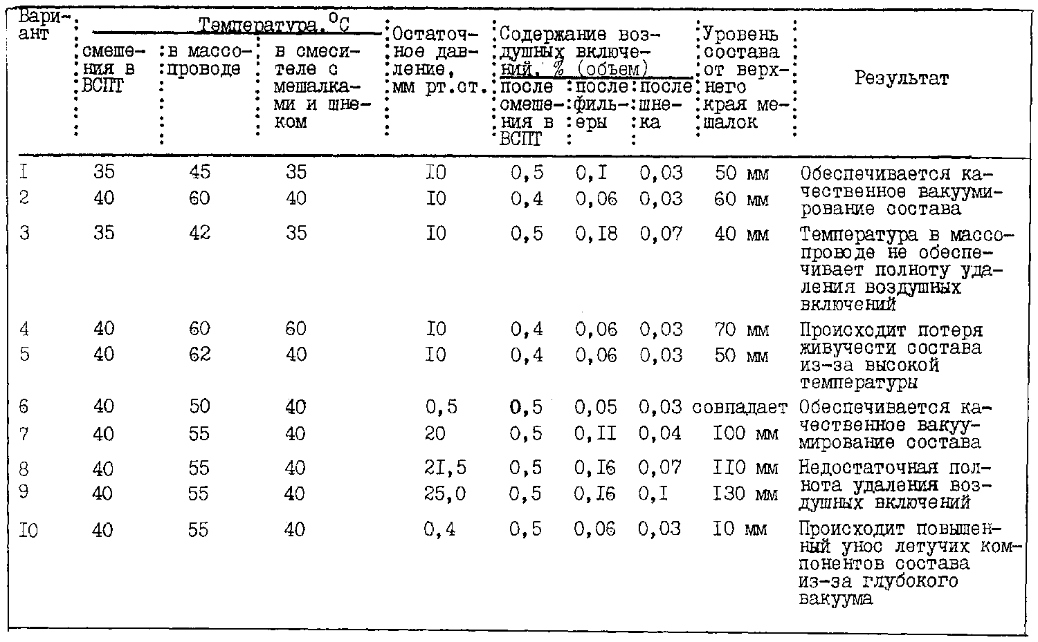 Из данных таблицы видно, что смешение состава по режимам предлагаемого способа (вариант 1, 2, 6, 7) обеспечивает качественное вакуумирование состава. Снижение температуры состава в масcопроводе (вариант 3), повышение величины остаточного давления в фильере на выходе и снижение уровня состава в смесителе более 100 мм от верхнего края мешалок (вариант 8, 9) снижают полноту удаления воздушных включений из состава, что приводит к ухудшению качества изготавливаемых изделий. Поддержание высокой температуры в смесителе с мешалками и нагнетающим шнеком (вариант 4, 5) удлиняет продолжительность пребывания состава при высокой температуре, что приводит к потере его жизнеспособности, снижение остаточного давления в фильере ниже 0,5 мм рт.ст. (вариант 10) приводит к повышенному уносу летучих компонентов состава, вследствие этого ухудшаются его эксплуатационные свойства.