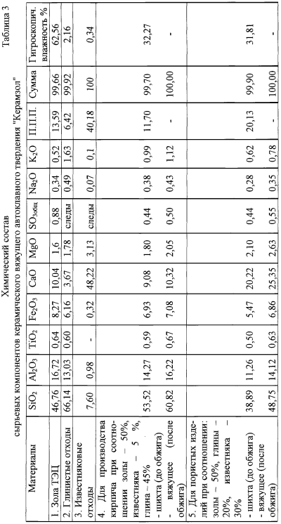 Изобретение относится к области производства строительных материалов, а именно керамических материалов, в том числе пористых и прессованных изделий, – и может быть использовано при изготовлении огнеупоров, теплоизоляционных материалов, глинозольного кирпича. Известно керамическое вяжущее, полученное термообработкой глины, известняка, золы бурых углей и отхода производства металлического висмута (а.с. СССР №1418312 А1, 23.08.1988, кл. С 04 В 7/38), содержащее, мас.%: – золу бурых углей 5,1-6,4 – глинистый компонент 20,5-21,6 – отход производства металлического висмута 0,5-1,0 – мел остальное Недостатки известного керамического вяжущего: – узкий диапазон изменения состава вяжущего; – специфичность одного из компонентов вяжущего, а именно: отхода производства металлического висмута; – высокое содержание относительно дорогостоящего компонента – мела. Известен способ получения силикатного кирпича на основе известково-кремнеземистого вяжущего автоклавного твердения (Патент РФ №2000111927, кл. В 28 В 15/00, аналог), включающий: – смешение компонентов вяжущего; – смешение вяжущего с наполнителем; – увлажнение смеси и гашение извести; – формование; – автоклавную обработку формованных изделий. Недостатки известного способа: – относительно высокая объемная масса изделий; – недостаточная механическая прочность изделий. Известен также способ изготовления керамических материалов на основе керамического вяжущего (Патент РФ №2204542 C1, C 04 B, 35/10, с.5, прототип), включающий: – смешение сырьевых компонентов: электрокорунда, сульфатно-спиртовой бражки и керамической связки – бентонита; – формование изделий; – прессование в разъемной пресс-форме; – сушку; – обжиг сформованных изделий. Указанный способ эффективен при изготовлении дорогостоящей специфической керамики на основе высококачественного сырья: электрокорунд, бентонит, сульфатно-спиртовая бражка. При использовании дешевого сырья, отходов производств керамические материалы имеют низкое качество из-за неполноты гашения извести и негомогенности смеси. Технический результат настоящего изобретения заключается в том, что разработан способ получения нового вяжущего автоклавного твердения, с помощью которого получают дешевые керамические строительные материалы, имеющие сниженную объемную массу при высокой механической прочности. Технический результат настоящего изобретения достигается тем, что для приготовления керамического вяжущего автоклавного твердения используется дешевое, недефицитное сырье: глинистые и известняковые отходы, зола теплоэлектростанций, – а формованные изделия подвергаются термообработке при температуре 174-210°С и давлении 0,8-1,6 МН/м2 в атмосфере насыщенного водяного пара. Глинистые отходы – это вторичное глинистое сырье, признанное непригодным для применения в производстве керамических материалов из-за сверхнормативного содержания карбонатных включений. Известняковые отходы характеризуются высокой степенью дисперсности и являются отсевом фракционирования известняка перед его обжигом. Исследованием уровня техники установлено, что изобретений, содержащих способ получения керамических материалов на основе керамического вяжущего автоклавного твердения, дополнительно включающих термообработку сформованных изделий при температуре 174-210°С и давлении 0,8-1,6 МН/м2 