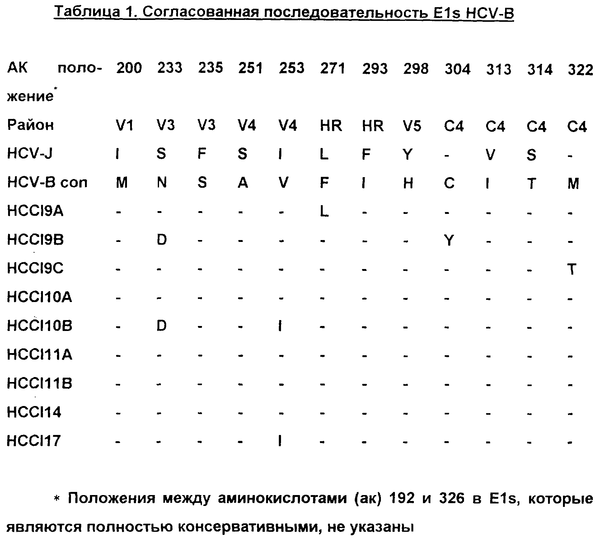 В таблице 1 представлены последовательности клонов Е1, полученных от одного хронического носителя, конструкция Е1, использованная для продуцирования вакцины, представляет собой согласованную последовательность всех этих индивидуальных клонов. V1-V5, вариабельные районы 1-5; С4, константный домен 4; HR, гидрофобный район; HCV-B con, согласованная последовательность в положениях, которые являются вариабельными между клонами и HCV-J.
