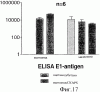 Фиг.17. Титры антител, полученные у мышей при иммунизации различными препаратами Е1, как описано в примере 9. Титры определяли с помощью ELISA: мышиные сыворотки разбавляли 1/20 и далее (0,5 log10) и инкубировали на E1s (модифицированном либо ацетамидом, либо малеимидом), нанесенном на титрационные микропланшеты. После отмывки связанные антитела обнаруживали, используя специфическую вторичную антисыворотку против IgG мыши, конъюгированную с пероксидазой. В качестве субстрата для цветового проявления использовали ТМВ. Результаты выражены в виде конечного титра, показаны стандартные отклонения (n=6).