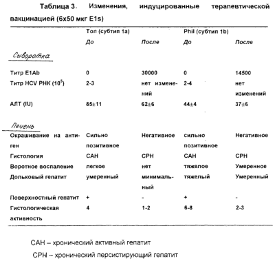 В таблице 3 представлен схематический обзор изменений, индуцированных терапевтической вакцинацией у двух хронически инфицированных шимпанзе (Ton и Phil). Анализ проводили, как описано для Фиг.8 и 11. Кроме того, оценивали гистологию и воспаление на основании биопсий печени.