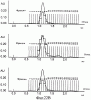 Фиг.23. SEC профиль конечной стадии снижения детергента (от 0,2 до 0,5% CHAPS): частица одного Е1 генотипа 1b (сверху), частица одного Е1 генотипа 4 (в середине) или эквимолярная смесь Е1 генотипа 1b и 4; смешанная частица (снизу). На этой фигуре также показано перекрывание значений ОП ELISA, специфически обнаруживающего только смешанные частицы (смотри также Фиг.22).