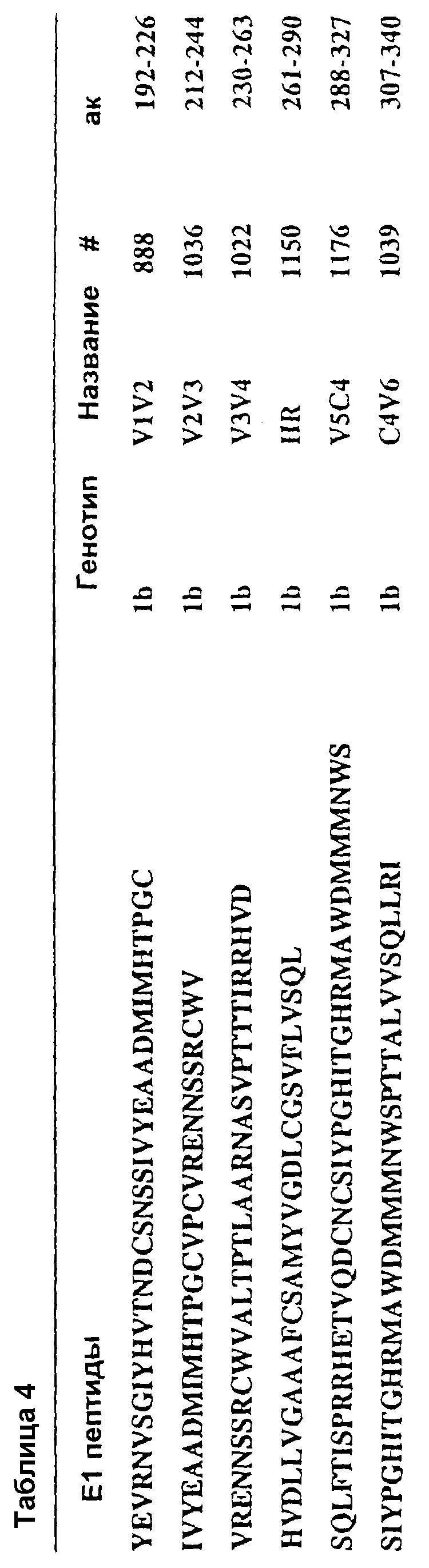 В таблице 4 представлены последовательности пептидов, использованных для картирования эпитопов В-клеток. Отметим, что HR перекрывается с V4V5.