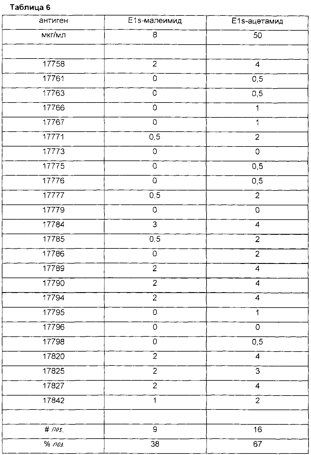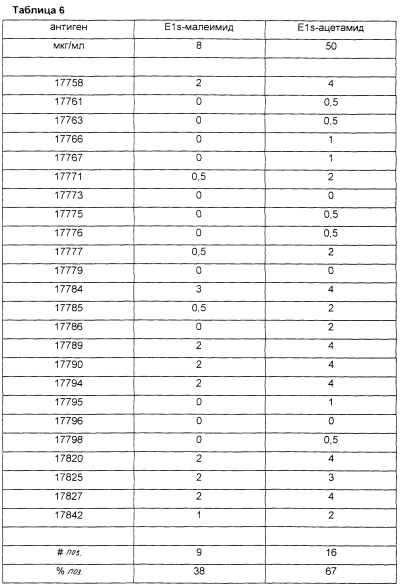 В таблице 6 показана реактивность в LIA (иммунолюминесцентный анализ) E1s-ацетамида против E1s-малеимида с сыворотками хронических носителей HCV. Белки иммобилизовали на LIA мембранах. E1s-ацетамид сам по себе распыляли на полосках LIA, тогда как E1s-малеимид (также содержащий биотин-малеимид) перед распылением подвергали комплексованию со стрептавидином. Антигены связывали с LIA-мембранами и полоски обрабатывали по существу, как описано в Zrein et al. (1998). Человеческие антитела, направленные против этих антигенов, визуализировали, используя человеческий анти-IgG, конъюгированный с щелочной фосфатазой. NBT (нитросиний тетразолий) и BCIP (5-бром-4-хлор-3-индолилфосфат) использовали для цветового проявления полоски. Окрашивание оценивали от 0,5 до 4, как указано в Zrein et al. (1998). Число (#поз.) и процент (%поз.) позитивных образцов указаны в нижней части таблицы с использованием отсечки для данного анализа, равной 0,5.