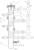 Исходя из технологической необходимости, принимается минимально достаточное количество секций 1 цементировочной головки в зависимости от количества цементировочных пробок. Секции последовательно устанавливаются одна на другую стыковочными узлами 2 с уплотнениями, стягиваются накидными гайками 3 и обвязываются общей внешней линией гидравлической связи с помощью быстроразъемных узлов. Верхняя секция головки оснащается ниппельной уплотнительной крышкой, манометром и прижимается быстроразъемной накидной гайкой. Цементировочная головка навинчивается на цементировочную колонну, присоединяется к линии подачи рабочих жидкостей от насосных агрегатов. Устанавливается узел сигнализации. Выполнив необходимые манипуляции с кранами кран 12 устанавливается в положение “открыто” и через присоединительный узел 16 на головке делают контрольную промывку скважины. После завершения промывки, выполнив новую манипуляцию с кранами, вывинчиваются фиксаторы под нижней пробкой и через отвод в головку подается первая из рабочих жидкостей, вытесняя нижнюю цементировочную пробку из головки в колонну. Давление при этой операции через стояк передается в верхние камеры, на манометр, датчик и предохранительное устройство. При этом пробка, проходя мимо сигнального устройства, своим оперением нажимает на рычаг, а через него – на шток, рейка 19 смещается относительно шестеренки счетчика, приводя зубчатую передачу во вращение, и счетчик дает показание о сбросе первой пробки.
