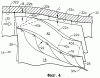 Как показано на фигуре 1, внутренняя поверхность корпуса 32 дополнительно включает в себя кольцевую впускную часть 32d, находящуюся впереди, если смотреть в направлении потока, относительно передней части 32b с внешней стороны по отношению к передним кромкам 26 лопаток. Впускная часть 32d может быть выполнена цилиндрической, конически расходящейся или же конически сходящейся и располагается соосно другим частям корпуса, обеспечивая поступление к ним воздушного потока 30. На фигуре 4 впускная часть 32d показана в предпочтительном расходящемся в осевом направлении исполнении с плавным сопряжением ее с передней частью 32b кожуха, что позволяет получить максимальное проходное сечение во впускной зоне 40а.