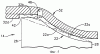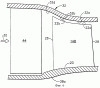 Дополняющие рассматриваемый контур кромки 22 при вершине лопаток включают в себя переднюю в осевом направлении часть 22b, а также промежуточную, или расположенную в середине хорды, часть 22с, которые проходят параллельно соответствующим частям корпуса. Соответствующие части кромки при вершине лопаток имеют контур, точно повторяющий контур соответствующих им частей внутренней поверхности, корпуса, охватывающей лопатки, на участке между передней и задней кромками лопаток, благодаря чему выдерживается по существу равномерный радиальный зазор В между этими кромками и внутренней поверхностью корпуса. Поскольку промежуточная часть 32с корпуса выполнена сходящейся в направлении потока, то и промежуточная часть 22с кромки при вершине лопаток также выполнена сходящейся или же наклонной внутрь по профилю в осевом направлении на участке между передней и задней ее частями.