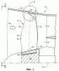 Важное значение такого предпочтительного контура, предложенного для корпуса 32, может быть дополнительно оценено при рассмотрении фигуры 5, на которой контуры корпуса и дополняющей его лопатки вентилятора представлены в еще более увеличенном масштабе. Пунктирной линией, проведенной внутри корпуса 32, показана обычная для него коническая конфигурация, которая сочетается в работе с прямолинейной конической кромкой при вершине лопатки, показанной штрихпунктирной линией в виде осевого профиля, характерного для обычной лопатки вентилятора. Путем выполнения задней части 32а внутренней поверхности корпуса таким образом, чтобы она имела в осевом направлении выпуклую форму впереди, если смотреть в направлении потока, задних кромок лопаток, может быть получено местное уменьшение диффузии в вихре, создаваемом во время работы у кромки при вершине лопатки.
