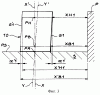 Следует отметить, что способ согласно изобретению можно упростить по сравнению с предпочтительным вариантом выполнения, описанным выше. Это означает, что вместо выполнения двух измерений на противоположных образующих компонента в каждой измерительной плоскости можно выполнять только одно измерение на уровне верхней и нижней точек между прямой линией отсчета и одной из образующих компонента. Аналогичным образом вместо выполнения измерений в двух плоскостях отсчета, перпендикулярных друг другу, можно ограничиться измерениями только в одной из этих плоскостей, что приводит к отказу от одной из пар микрометров и от соответствующего стержня отсчета. Кроме того, каждая прямая линия отсчета, используемая для измерения, может быть образована не образующей G или G’ стержня Т или Т’ отсчета, а любым другим образом без отклонения от идеи изобретения. Наконец, следует отметить, что указанная горизонтальная ориентация опорной плоскости PS не является обязательной, если обеспечивается плотный контакт между круговой лицевой поверхностью компонента и этой опорной плоскостью с помощью механических, пневматических или других средств. В результате изменяется ориентация лазерных микрометров.