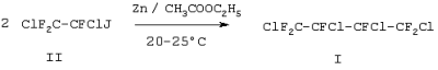 Изобретение относится к органической химии, а точнее к получению катализатора деиодирования и способу получения гексафтор-1,2,3,4-тетрахлорбутана. Наиболее эффективно предлагаемая каталитическая композиция может быть использована для получения полихлорперфторуглеводородов, в частности, для получения гексафтор-1,2,3,4-тетрахлорбутана формулы (1). CF2Cl-CFCl-CFCl-CF2Cl (1) Последний является хладоном широкого назначения и используется, в частности, в качестве исходного соединения при получении промышленного мономера – перфторбутадиена. (M.Prober, W-m T.Miller, J.Am.Chem.Soc., 1949, 71, 598-602), а также в качестве добавки к ракетному топливу (L.Spenadel, H.Bieber, US 3388015; 1968). Известна каталитическая система, содержащая цинковую пыль и диоксан (соотношение массовых частей 1:1), которая используется для синтеза соединения (1) из трифтор-1,2-дихлориодэтана формулы (II) при 30-100°С. CF2Cl-CFClJ (II) Недостатком данной каталитической системы является ее чрезмерная активность, в результате чего происходит внутримолекулярное отщепление JCl и образуется большое количество (до 40%) побочного продукта – трифторхлорэтилена. Гексафтор-1,2,3,4-тетрахлорбутан (1) не удается выделить с заметным выходом, так как, образуясь, он сразу же дехлорируется в перфторбутадиен (R.N.Haszeldine, J.Chem.Soc., 1952, 4423-4431). Известно получение гексафтор-1,2,3,4-тетрахлорбутана (1) деиодированием трифтор-1,2-дихлориодэтана (II) встряхиванием его с металлической ртутью в кварцевой трубке при УФ-облучении. Этот способ не является технологичным из-за высокой токсичности ртути, (R.N.Haszeldine, J.Chem.Soc., 1952, 4423-4431). Известно использование при получении соединения (1) каталитической системы, состоящей из гранулированного цинка, уксусного ангидрида и металенхлорида (соотношение массовых частей 3,3:8:10). При ее использовании гексафтор-1,2,3,4-тетрахлорбутан (1) образуется с выходом 51%. Недостатком способа получения соединения (1) при использовании данной каталитической системы является сложность обработки реакционной массы с целью удаления уксусного ангидрида, металенхлорида и избытка цинка, что снижает технологичность процесса. (A.L.Henne, W.Postelheck, J.Am.Chem.Soc., 1955, 77, 2334). Известен способ получения гексафтор-1,2,3,4-тетрахлорбутана (1) из трифтор-1,2-дихлориодэтана (II) с использованием каталитической системы, состоящей из гранулированного цинка, этилацетата и метиленхлорида (соотношение массовых частей 4,5:20:27) при 45-50°С, который выбран в качестве прототипа как наиболее близкий по технической сущности. Основным недостатком при использовании данной каталитической системы является образование наряду с (1) нескольких побочных продуктов, что затрудняет выделение целевого соединения (1). Его выход достигает лишь 20%. (T.M.Keller, P.Tarrant, J.Fluorine Chem., 1975, 6, 105-113). Задача настоящего изобретения состоит в создании эффективного катализатора деиодирования, который позволит получить гексафтор-1,2,3,4-тетрахлорбутан (1) более технологичным путем с высоким выходом и высокой степенью чистоты целевого продукта. Поставленная задача решается тем, что каталитическая композиция для деиодирования трифтор-1,2-дихлориодэтана (II) содержит этиловый эфир уксусной кислоты и металлический цинк в виде гранул размером 3-6 мм при следующем соотношении компонентов (массовые части): Цинк гранулированный с размером гранул 3-6 мм – 8-50; Этиловый эфир уксусной кислоты – 0,95-1, а соотношение этилового эфира уксусной кислоты и тр