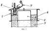 Смесь уплотняется ручной трамбовкой 8. После того как уровень уплотненной смеси окажется чуть выше верхней поверхности съемных пустотообразователей 2, скребком 7 срезают излишки смеси, с опорой на верхнюю поверхность съемных пустотообразователей 2. После этого из формы 1 вынимают штыри 3 и 4, а затем поднимают съемные пустотообразователи 2, которые имеют некоторое сужение книзу, благодаря чему для их извлечения не требуется больших усилий. После первого этапа распалубки напряженное состояние смеси исчезает, и подъем формы 1 осуществляется малыми усилиями, не смотря на то, что стенки формы 1 выполнены параллельными, без сужения кверху.