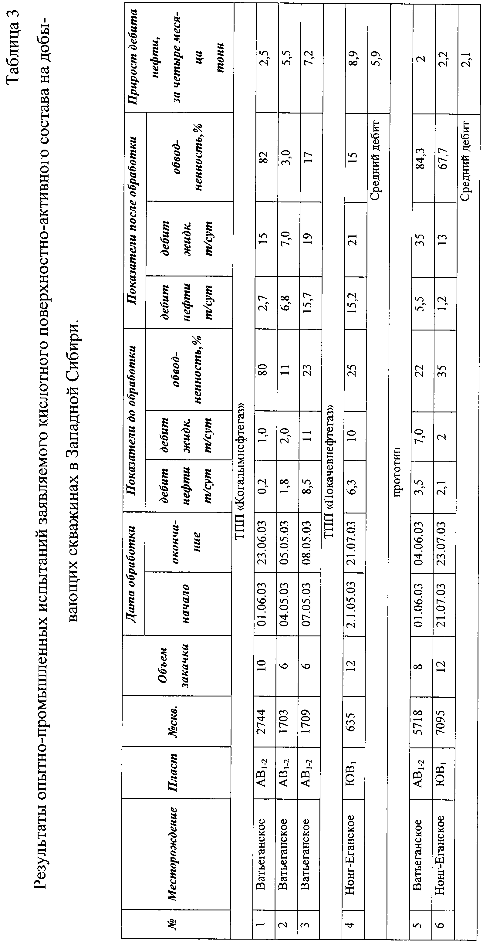 Результаты испытаний заявляемого и известного состава, взятого за прототип, представлены в табл.1 и 2. Из представленных в табл.1 данных следует, что предлагаемый состав обладает более низкой скоростью взаимодействия с карбонатной породой, скорость взаимодействия понижается по сравнению с прототипом в 3-5 раз. Результаты испытаний показывают, что при содержании взаимного растворителя менее 10% скорость взаимодействия с карбонатной породой понижается незначительно, а концентрация выше 30% невыгодна по экономическим соображениям. Одновременное введение в предлагаемый состав НПАВ и взаимного растворителя позволяет снизить скорость взаимодействия состава с карбонатной породой при оптимальном содержании взаимного растворителя (10-30%). В табл.2 приведены данные по изменению фильтрационного сопротивления пласта с использованием предлагаемого и известного состава. Как видно из данных, приведенных в табл. 2, предлагаемый состав увеличивает проницаемость пористой среды в 5,8-9,5 раз, состав по прототипу только в 3-4,5 раза. Таким образом, предлагаемый состав обладает следующими преимуществами по сравнению с прототипом: – за счет уменьшения скорости растворения породы, слагающей призабойную зону пласта, повышает проникающую способность кислотного состава; – присутствие в составе взаимного растворителя способствует растворению АСПО, что в свою очередь повышает гидрофобизующие свойства породы пласта, а это ведет к увеличению проницаемости не только по воде, но и по нефти и снижению адсорбции НПАВ на породе пласта. Опытно-промышленные испытания заявляемого состава подтвердили его эффективность. Как показали результаты испытаний (табл.3) прирост дебита нефти после закачки заявляемого состава по обработанным скважинам превышает прирост дебита нефти после обработки составом прототипом в 3 раза.