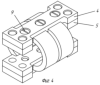 В промежутках между пазами 6 выполнены отверстия 8 для прочного скрепления двух половин 4 и 5 каждой из обойм 1 и 2 с помощью заклепок при защемлении многослойных пакетов лент 3 (фиг.1). Кроме заклепок для скрепления двух половин 4 и 5 могут быть использованы, например, винты 9 (фиг.4). При этом в одной из планок, например 5, выполняют резьбовые отверстия, а в планках 4 – гладкие соосные отверстия без резьбы.