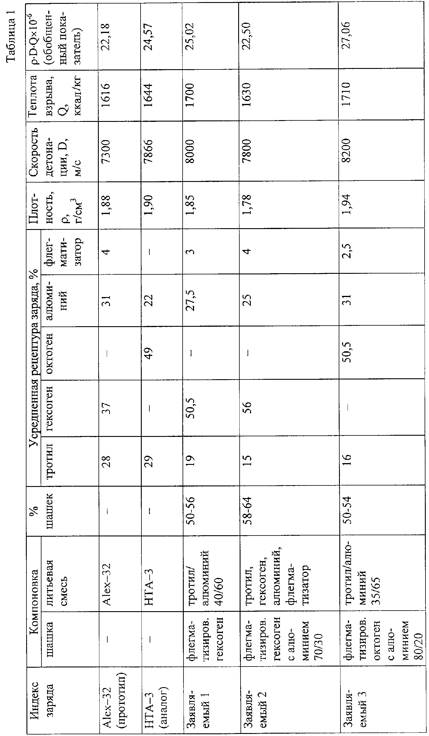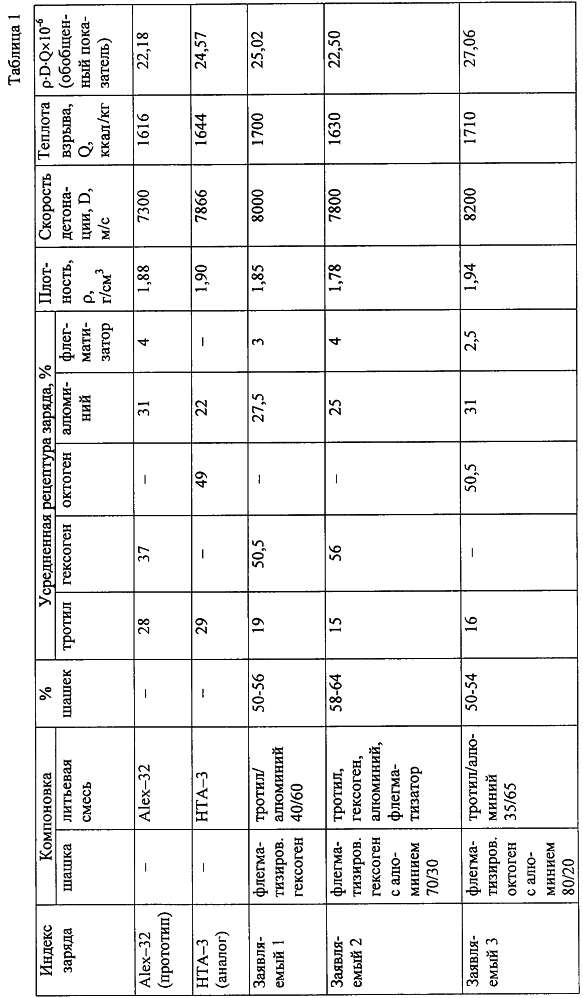 Как явствует из данных таблицы 1, представленные варианты заявляемого заряда имеют гораздо более выгодный компонентный состав и существенно превосходят прототип и октогенсодержащий аналог по скорости детонации, теплоте взрывчатого превращения и обобщенному показателю бризантно-фугасного действия – ·D·Q.
