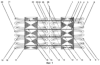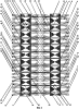 для 36-фазного трансформатора фиг.2). Внутренние магнитопроводы (1, 9 и 2 – фиг.1; 1, 39, 27, 40, 28, 41, 29, 42, 30, 9, 2 – фиг.2) примыкают друг к другу торцовыми поверхностями через немагнитные прокладки (25 и 26 – фиг.1, фиг.2 (на фиг.2 немагнитные прокладки обозначены только между магнитопроводами 1 и 39, 39 и 27, 9 и 2 для облегчения чтения чертежа). Боковые магнитопроводы (12 и 13 – фиг.1, фиг.2) примыкают к торцовым поверхностям внутренних магнитопроводов (1 и 2 – фиг.1, фиг.2) активными торцовыми поверхностями (14 и 17 – фиг.1, фиг.2) через немагнитные прокладки (23 и 24 – фиг.1, фиг.2). Количество k1 внутренних магнитопроводов с первичными обмотками и количество k2в внутренних магнитопроводов с вторичными обмотками определяется числом фаз mт выходного напряжения многофазного трансформатора и числом фаз m2 вторичных обмоток соотношениями и k1=k2в+1.