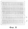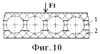 на фиг.8 показана схема брони, вариант с матрицей, с цилиндрическими, невзаимосвязанными пружинами и с полным заполнением матрицей объема, свободного от материала пружин, фрагмент вида в плане (фронтальная поверхность брони);
