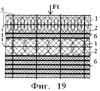 на фиг.19 – схема многослойной брони, со смещенными на 90° рядами пружин, с индивидуальной для каждого слоя резиновой матрицей, с дополнительными одним промежуточным и несколькими тыльными слоями материала (ткани из арамидных волокон) и с прошивкой, поперечный разрез;