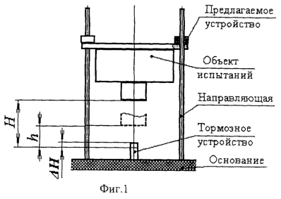 Использование заявляемого устройства, помимо строго однократного приложения к исследуемым конструкциям произвольной массы различных по величине импульсов ударной нагрузки, решает и вторую задачу, а именно: оно позволяет зафиксировать максимальную высоту отскока h. Данные о высоте свободного сброса Н стола с испытуемым изделием и высоте отскока h могут быть использованы для четкого разделения испытательного импульса (см. фиг.3) на активную часть а (при торможении испытательной сборки) и пассивную n (при разгоне в фазе отскока за счет упругих сил тормозного устройства и испытательной сборки), а также для уточнения калибровки акселерометров, которые, как правило, применяются при ударных испытаниях для контроля динамического поведения элементов объекта испытания.