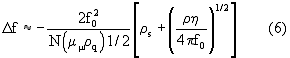где f0 представляет собой невозмущенную резонансную частоту кварцевого кристалла; N представляет собой номер гармоники; представляет собой сдвиговую жесткость кварца, q представляет собой плотность кварца; s представляет собой поверхностную плотность массы осадка (масса/площадь), представляет собой плотность среды, соприкасающейся с резонатором, и представляет собой вязкость среды, соприкасающейся с резонатором.