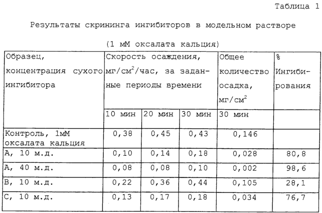 1 мМ (128 миллионных долей, м.д.) исследуемый раствор оксалата кальция приготавливается следующим образом. Оксалат натрия (0,268 г) и дигидрат хлорида кальция (0,294 г) по отдельности растворяют в 35 мл 0,1 н. НСl. Растворы разбавляются до 100 мл каждый с помощью деионизованной воды, смешиваются в условиях интенсивного перемешивания, и смешанный раствор разбавляется до объема 2 л, при этом деионизованная вода с 0,1 н. НСl добавляется по потребности для доведения рН до 2,6. Этот раствор используется в качестве контроля. При исследованиях добавляется потенциальный ингибитор. Образцы растворов по 700-900 мл используют вместе со свежими порциями, используемыми для каждого анализа.