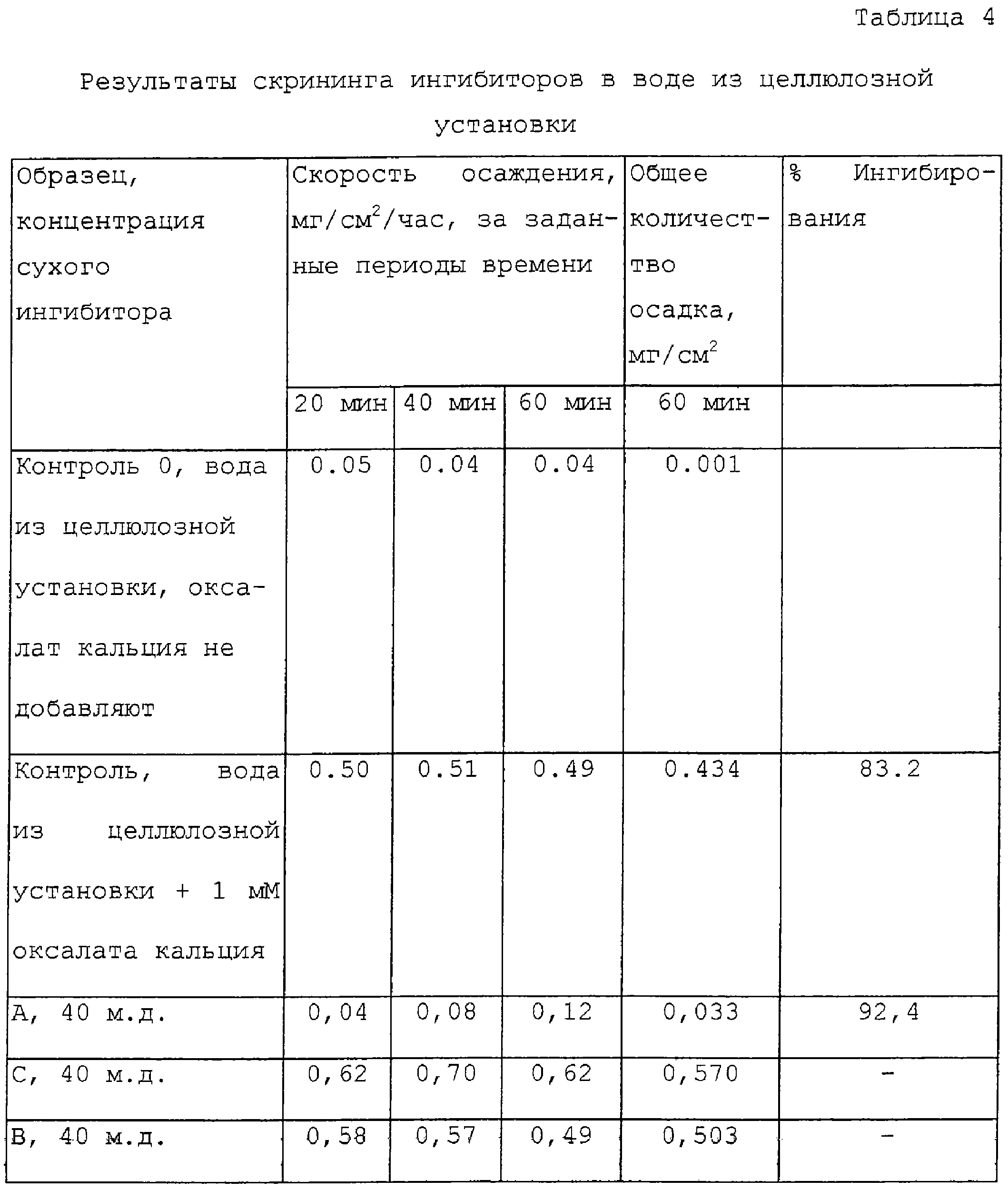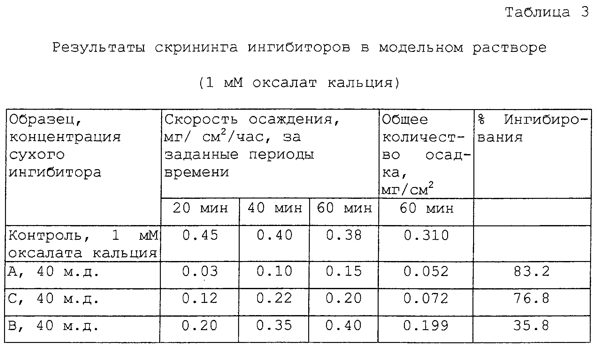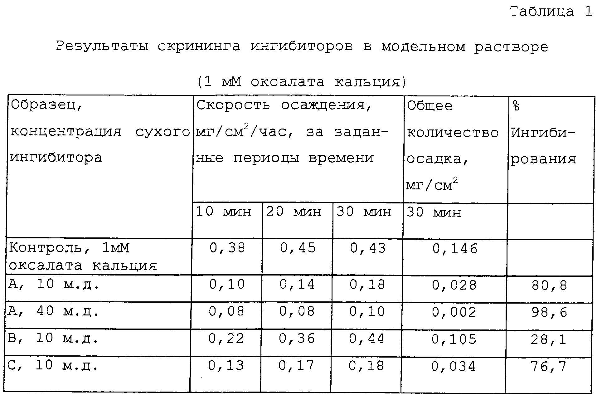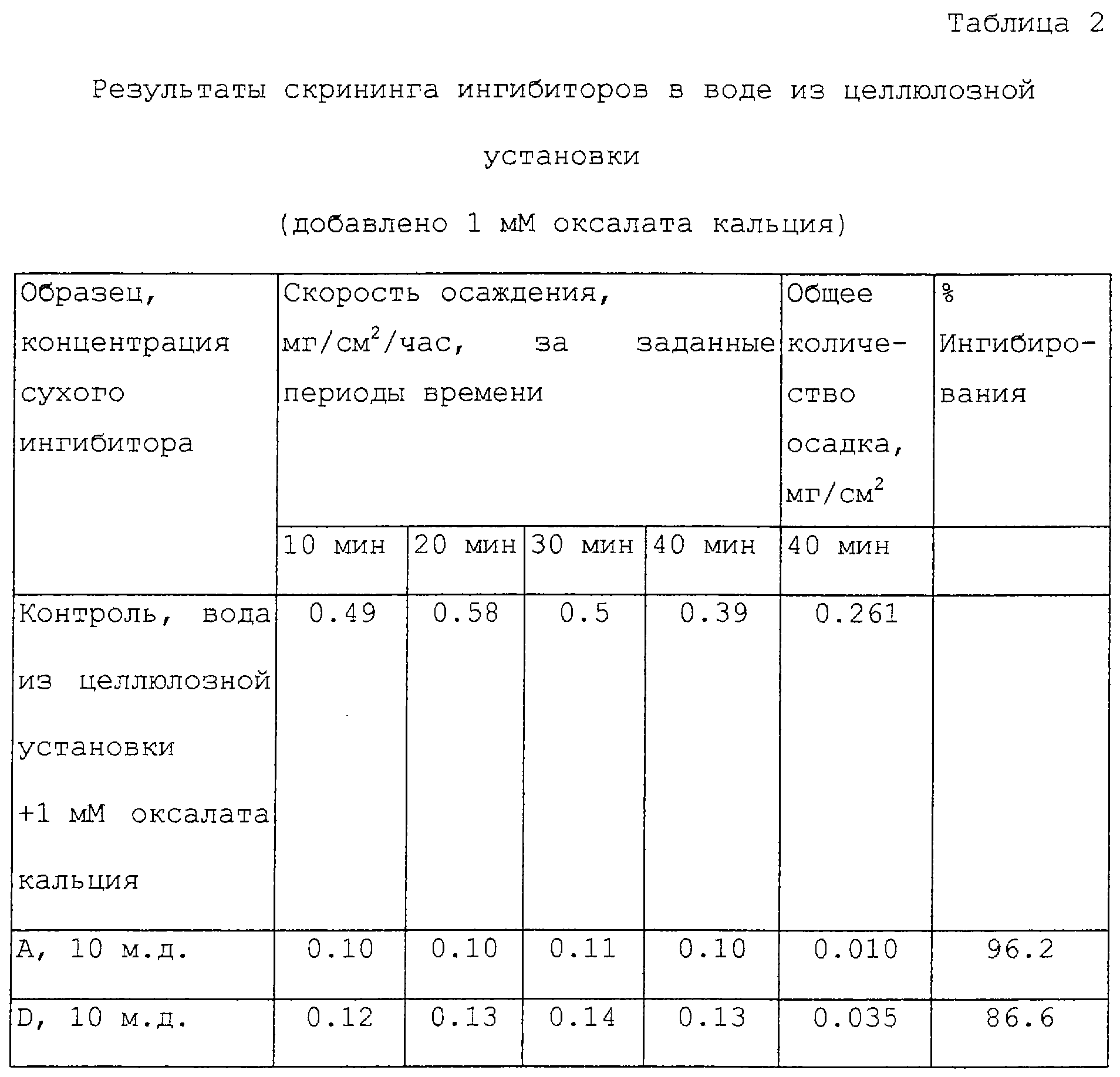 Способность раствора к образованию накипи оценивается по скорости осаждения, наблюдаемой в заданных интервалах времени, а также по общему осадку, аккумулируемому в конце исследования. Процент ингибирования вычисляется следующим образом: